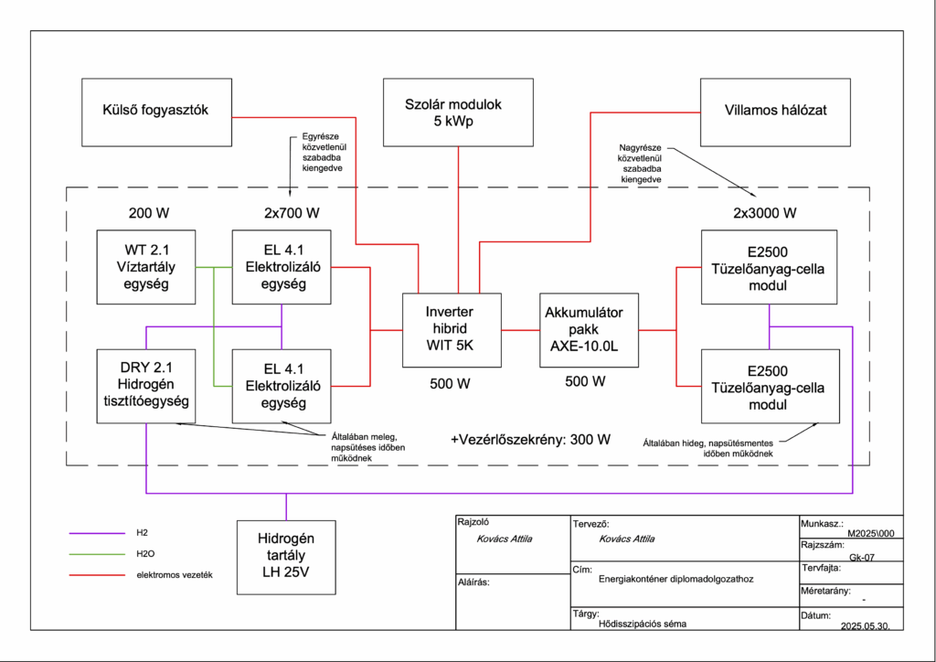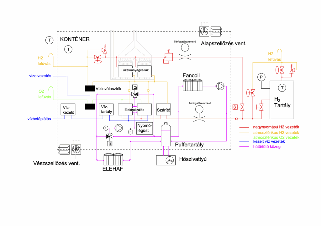 A konténeres rendszer alapját egy 20 lábas standard konténer képezi, amely ipari környezetben jól ismert és könnyen kezelhető egység. Ennek a megoldásnak az az előnye, hogy a technológia egyes elemei előre szerelhetőek és együtt szállíthatóak.  A belső térben négy rack szekrény kapott helyet: kettő a hidrogéntechnológiai egységeket (elektrolizálók és tüzelőanyagcellák), kettő pedig a villamos berendezéseket tartalmazza. Emellett elhelyezésre került egy 300 literes nyitott és egy 200 literes zárt tágulási tartály, valamint a szükséges csővezetékek, szivattyúk és szerelvények. A rendszer működése során a napelemek által termelt villamos energia először az akkumulátorokat tölti. Amikor ezek elérik a kapacitásuk felső határát, a többlet energiát az elektrolizálók használják fel, amelyek 35 bar nyomáson állítanak elő hidrogént. A hidrogént egy külső, 25 m³-es tartályban tároljuk, amely a későbbi visszanyeréshez szükséges.