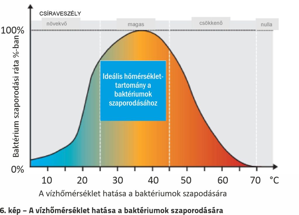 A baktériumok szaporodásához a legkedvezőbb a 25 °C feletti és 45 °C alatti vízhőmérséklet. A vízhálózatban kialakuló biofilmrétegek – a fent leírt hőmérsékletek esetén – ideális terepei a baktériumok szaporodásának. Ebből következik, hogy a csapolási ponton mért 20 °C alatti hideg víz, vagy 55 °C feletti meleg víz esetén a baktériumok szaporodása radikálisan csökkenthető. A hideg víz tehát maradjon hideg, amit a csapoló megnyitása után 120 másodperccel mérve, 20 °C-os érték alatt jó tartanunk. A gyakorlatban ennek elérésére több módszer van, amit a következőkben ismertetek. A meleg víz, és a cirkulációs vezetékben lévő víz hőmérséklete min. 55 °C-os, amit a melegvíz-csapolóból kiengedve 60 másodperc után kell elérjen. A HMV-tároló vizének minimum 60 °C-os hőmérsékletet kell elérnie. A termikus fertőtlenítésnél az időszakonként 70 °C-os vízhőmérséklet a csapolókig, azaz a legtávolabbi pontokig meg kell maradjon, így a baktériumok szaporodása nullára redukálható. A 70 °C-os vízhőmérséklet, a termikus fertőtlenítés egy régi horganyzott csövekből álló rendszer esetében lényegesen több belső horganyréteget old ki, mint a korábbi 45-50 °C-os vízhőmérséklet, így még gyorsabban alakulnak ki a csövön belüli zárványok, szigetek, érdes felületek, ami tökéletes a biofilmképződéshez. Így nem csak gyorsabban lyukadnak ki ezek a csövek a horganyréteg kioldása miatt, hanem a belső biofilmképződés is kedvez a baktériumok szaporodásának, a kiirtásukra tett lépések előli elrejtőzésének. A horganyzott csövekben lerakodó, megtapadó vízkőszigetek is remek felületet biztosítanak a biofilmképződéshez, a baktériumok terjedéséhez. Nem mindenhol előnyös a termikus fertőtlenítés, de például egy új, műanyag csövekből készített rendszernél, ahol a fémcsapolók belső felülete is sima (a cikk későbbi részében példát mutatok erre), nincs érdes belső felület, nem tud megtapadni a biofilmréteg, ez a módszer tökéletes lehet. Egy másik közismert módszer a baktériumok számának jelentős csökkentésére a vegyi fertőtlenítés. Ezt előszeretettel alkalmazzák az egészségügyi intézményekben, ahol klór vagy hidrogén-peroxid alapú fertőtlenítőszerekkel próbálják a baktériumok számát minimalizálni. Egy-egy ilyen vegyi fertőtlenítés nem tesz kárt az ivóvízrendszerben, de amennyiben ezt a módszert folyamatosan, tartósan alkalmazzák, a műanyag csőrendszereket a klór ridegíti, tönkreteszi, de még a rozsdamentes fém rendszerek sem bírják sokáig ezt az eljárást. 5 év alatt egy teljesen új csőrendszert tönkre lehet tenni így. Sorozatos csőlyukadások, rengeteg javítás és előbb vagy utóbb újbóli csőcsere következik. Erre van egy ide illő magyar mondásunk, miszerint kiöntötték a fürdővízzel a gyereket is. A baktériumok, higiénia kérdését megoldottuk ugyan, de közben tönkretettük a teljes vízhálózatunkat.