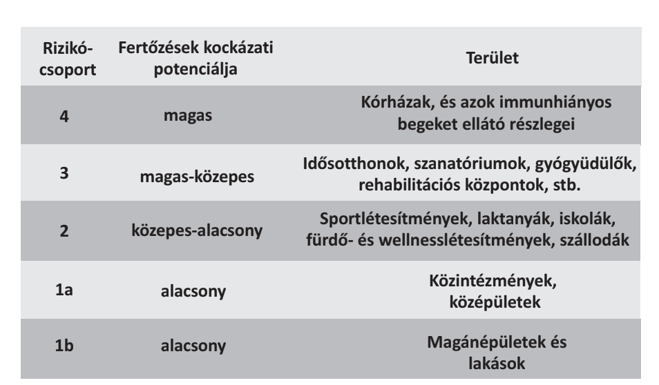 Mind a tervezés, de akár az üzemeltetés kapcsán is az első lépés az épület fertőzéskockázati besorolása (4. kép). Teljesen más veszélyességi osztály egy kórház vagy idősek otthona, ahol gyenge immunrendszerű betegek, újszülöttek, idős emberek használják az ivóvízrendszert, mint például egy olyan családi ház, ahol a 30-as éveik végén járó szülők és két tizenéves gyermekük él. Ezek a baktériumok elsősorban nem az egészséges embereket betegítik meg. A fertőzéskockázati besorolás alapján szükséges a megfelelő ellenintézkedéseket meghozni. Magas kockázati csoportba sorolhatók a kórházak vagy az immunhiányos betegeket ellátó intézmények. Magas-közepes besorolású létesítmények az idősotthonok, szanatóriumok, gyógyüdülők, rehabilitációs központok. Közepes-alacsony besorolásban említhetjük a sportlétesítményeket, a laktanyákat, az iskolákat, a fürdő- és wellnesslétesítményeket, vagy akár a szállodákat. Alacsony kockázati besorolásba kerül a többi közintézmény (pl. irodaházak), középületek, magánépületek, lakások.