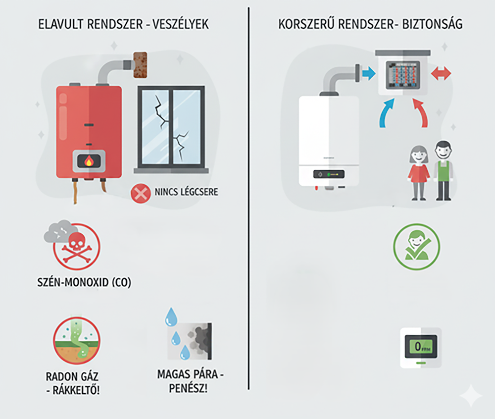 | Földszint | 40-70% | Kéményhatás | Kötelező |