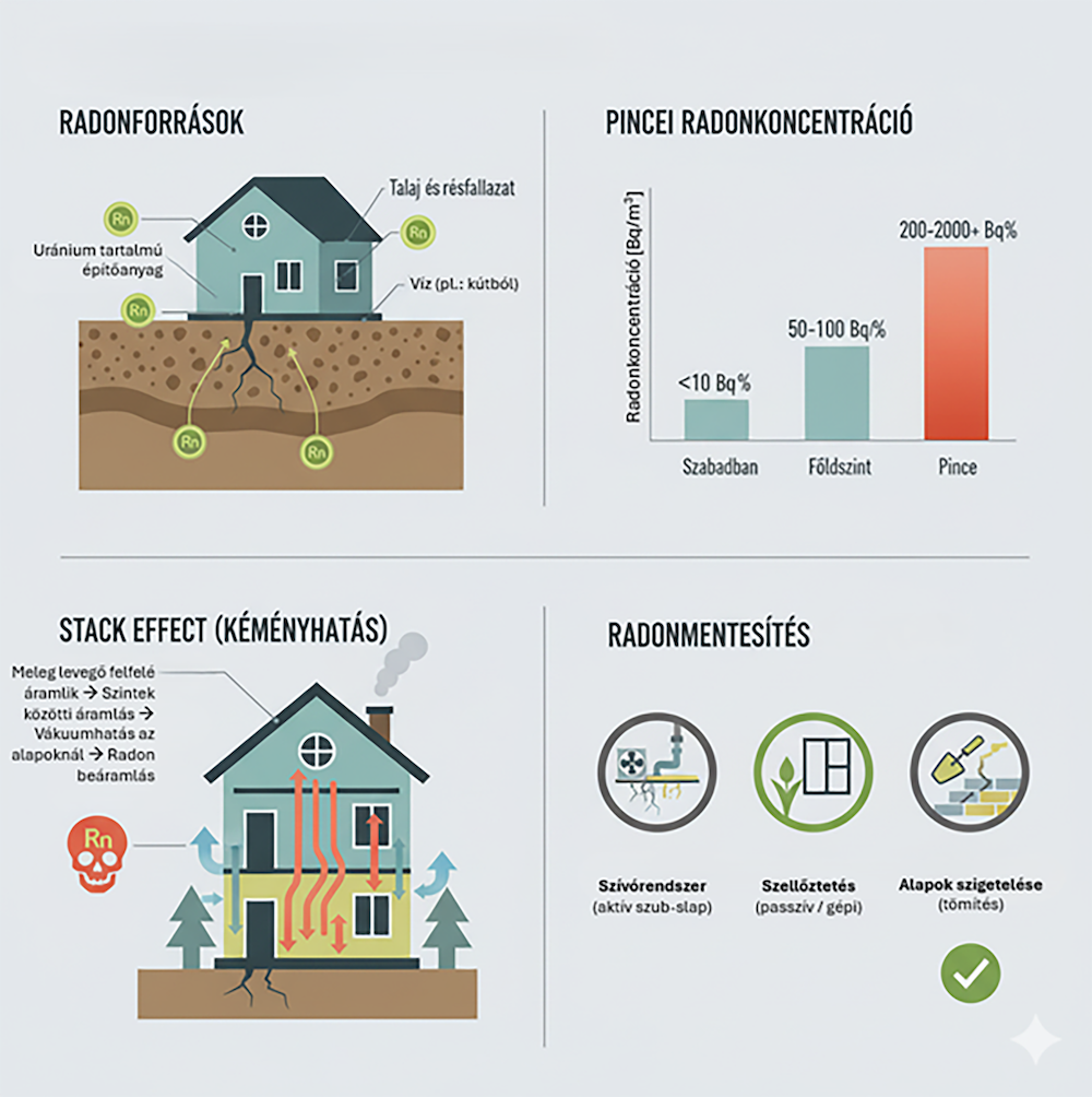 - Meglévő épületeknél radon mérés és szükség esetén utólagos mentesítés ajánlott, ha a koncentráció meghaladja a referencia szintet.