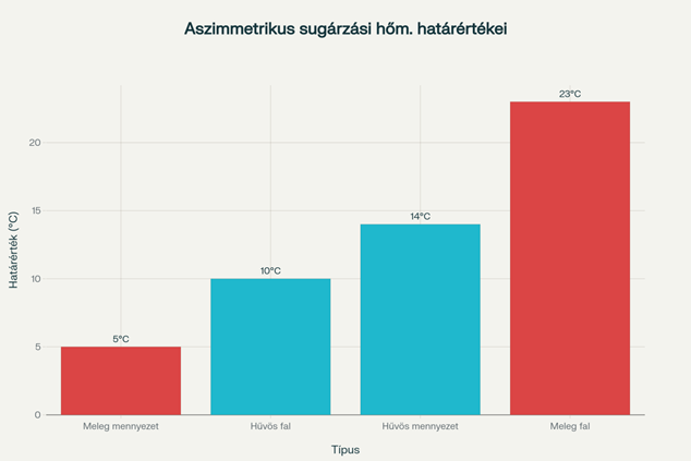 - Sugárzási aszimmetria szigorúbb határai: meleg mennyezet <4°C, hűvös fal <8°C