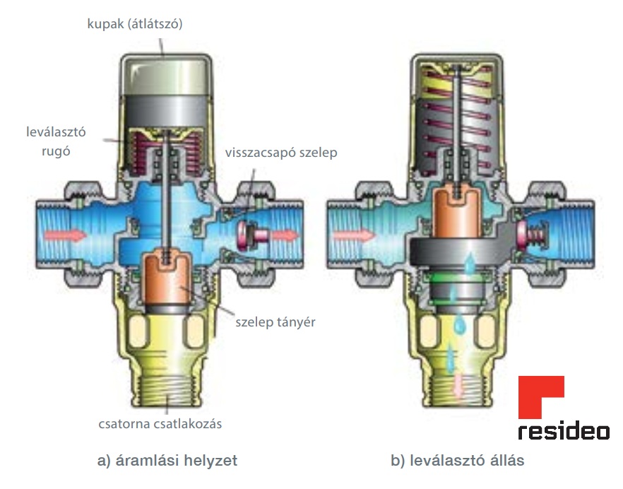 Ahogyan arról már volt szó, ha a víznyomás megegyezik a leválasztási nyomás értékével, vagy rosszabb esetben az alá zuhan, akkor a rugó a záróelemet felfelé, azaz a leválasztási helyzetbe húzza. Majd amikor a hálózati víz nyomása ismét visszaáll a biztonságos üzemhez szükséges elfogadható értékre, akkor az viszszanyomja a záróelemet a tömítőülékbe, lehetővé téve ezzel az újbóli szabad áramlást a szerelvényen keresztül.