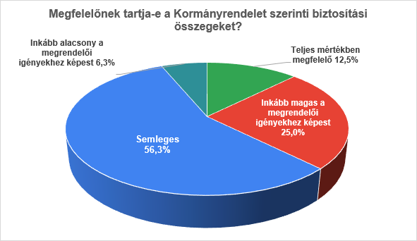 A válaszadók több mint fele (56,3%) semleges álláspontot képvisel a biztosítási összeggel kapcsolatban, negyedük úgy érzi, hogy a biztosítási összegek magasabbak, mint ami indokolt, és csak 12,5%-uk gondolja úgy, hogy a rendelet szerinti összegek pont jók.