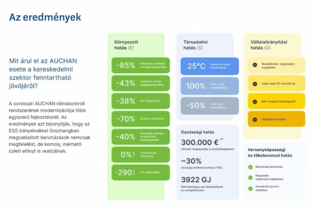 Vállalatirányítási (G) hatás: A valós idejű monitoring és adatvezérelt üzemeltetés révén az áruház működése átláthatóvá és auditálhatóvá vált. A mért adatok visszaigazolták az előzetes számításokat, biztosítva a jogszabályi megfelelést és a hosszú távon kiszámítható működést.