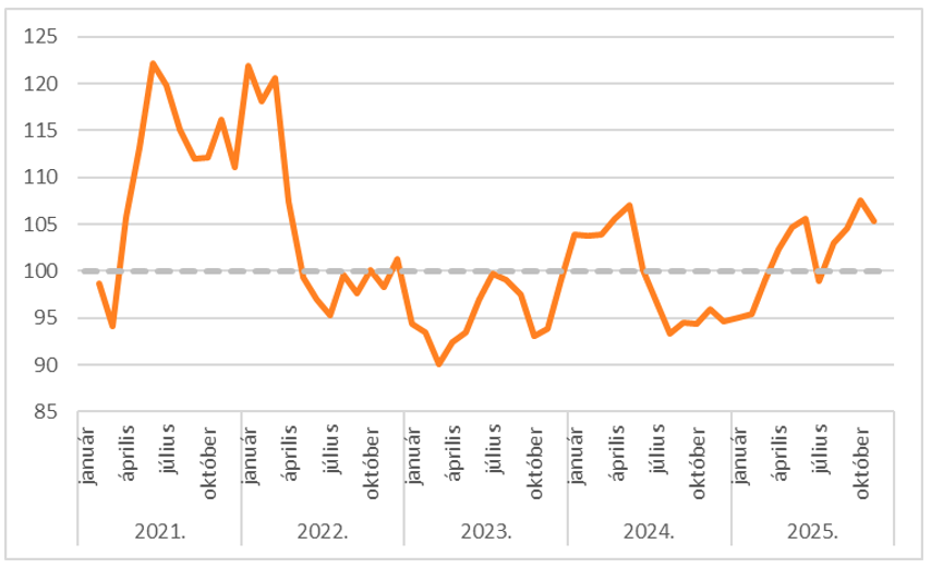 Az első negyedév egyértelmű visszaesést hozott, de áprilistól decemberig csaknem minden hónapban növekedést tudott elkönyvelni az ágazat. Így az év egészében a termelés volumene 2,8%-kal bővült 2024-hez képest, azaz az építőiparban elindult a növekedési ciklus. Erre szükség is van, mert a 2025-ös teljesítmény még így is 4%-kal elmaradt a 2022. évitől. A megkötött új szerződések állományában a tavalyi év első hét hónapjában folyamatos volt a mérséklődés, pozitív változás csak ezután következett be. 2025 decemberének végén a szektor teljes szerződésállománya csaknem 50%-kal volt magasabb, mint egy évvel korábban. Ez alapvetően kedvező jel, de kérdéses, hogy a megkötött több évre vonatkozó szerződések melyik évben fogják jelentősebben meghúzni az ágazat termelését.