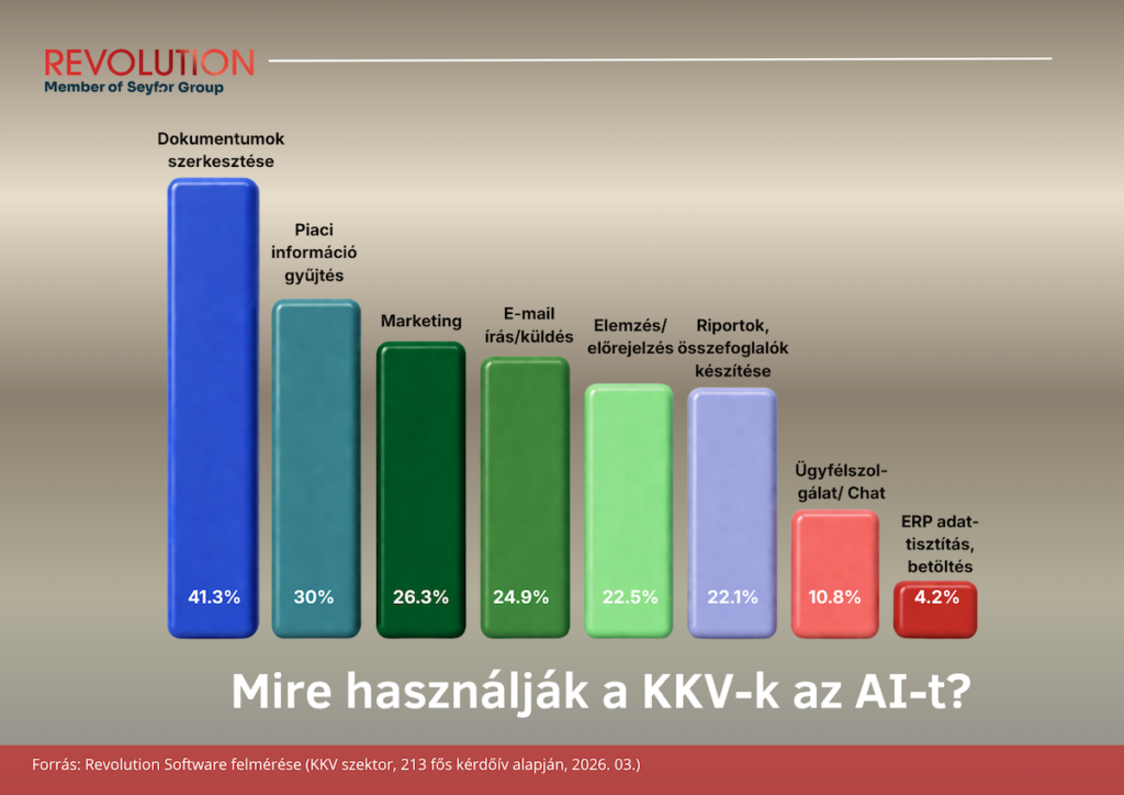 A felmérés adatai szerint az AI jelenleg elsősorban egyéni hatékonyságnövelő eszközként van jelen a hazai vállalkozások életében: a céges munkatársak leggyakrabban dokumentum szerkesztésre, információgyűjtésre vagy marketingfeladatokra használják, míg az olyan, valódi üzleti hatást jelentő területeken, mint az operatív folyamatok automatizálása vagy az ERP-adatok kezelése, még alig jelenik meg. A működésből hiányoznak a felelősök, a mérhetőség és az összekapcsolás.