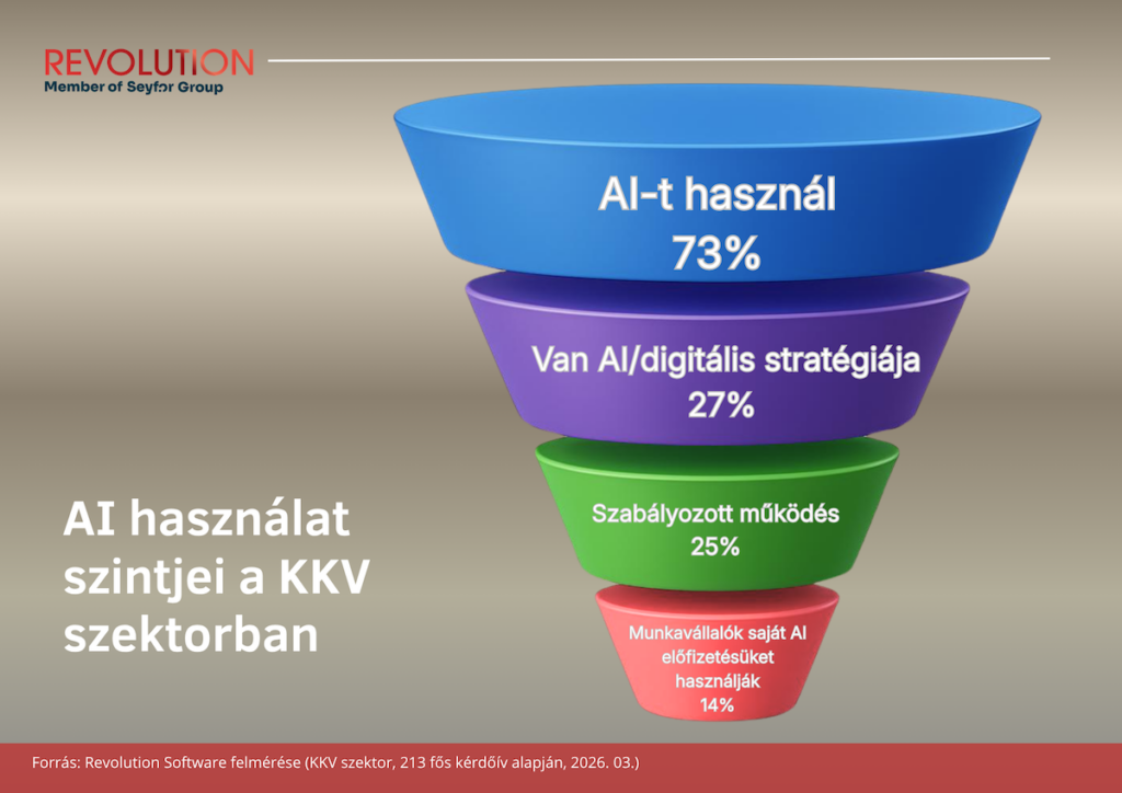 A hazai vállalkozások 73%-a már használ mesterséges intelligenciát valamilyen formában, de csupán minden negyediknél vannak szabályozott keretek az alkalmazására. Úgy tűnik, az AI gyorsabban terjed, mint ahogy a vállalatok képesek lennének rendszerszinten használni – derül ki a Revolution Software több mint 200 KKV bevonásával készült AI-digitális kutatásából.