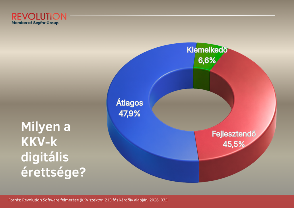 A felmérés komplexen is vizsgálta a vállalatok digitális érettségét; többek között a folyamatok dokumentáltsága, a működési hibák visszakövethetősége, az AI-szabályozás terén. Az eredmények alapján a vállalatok közel fele (45,5%) digitálisan fejlesztendő kategóriába tartozik, további 47,9% pedig csak átlagos szinten működik, és mindössze 6,6% tekinthető valóban kiemelkedőnek. Ez azt jelenti, hogy a cégek többsége már túllépett az analóg működésen, de még nem jutott el oda, hogy folyamatai stabilan, rendszerszinten és skálázható módon működjenek. Azok a vállalkozások, akik digitálisan érett kategóriába tartoznak, jellemzően már ügyviteli, ERP megoldással is rendelkeznek.