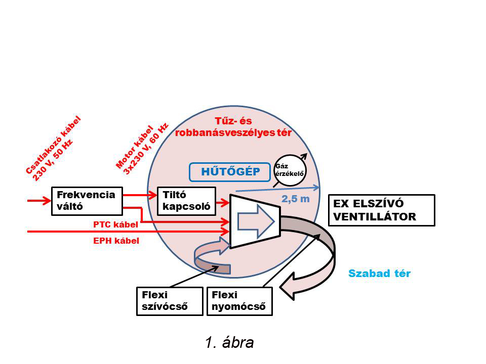 A rendszer elvi működési vázlatát az 1. ábrán láthatjuk. A berendezés gyártása során szakmai támogatást kaptunk a robbanásbiztonság – technika egyik hazai képviselő cégétől. A ventilátor egységet úgy alakítottuk ki, hogy alkalmas legyen egy átlagos méretű szerviz gépkocsiban történő szállításra. A berendezés elektromos csatlakozása normál 230 Voltos, földelt villamos hálózatról működtethető a mellékelt gyártói használati útmutató maradéktalan betartása mellett.