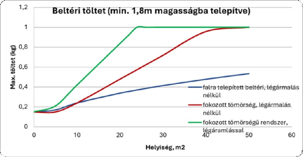 A példa 4 egymásra épülő biztonsági megoldás esetén demonstrálja a hűtőközeg-töltet és helyiségméret relációját az IEC 60335-2-40 szabvány 7. kiadása24 alapján, osztott rendszerre beltéri telepítés esetén. A zöld színnel jelölt sáv felett nem lehet biztonságosan A3-hűtőközeget alkalmazó beltéri egységet telepíteni adott helyiségbe, azaz további műszaki biztonsági megoldások alkalmazása válik szükségessé.